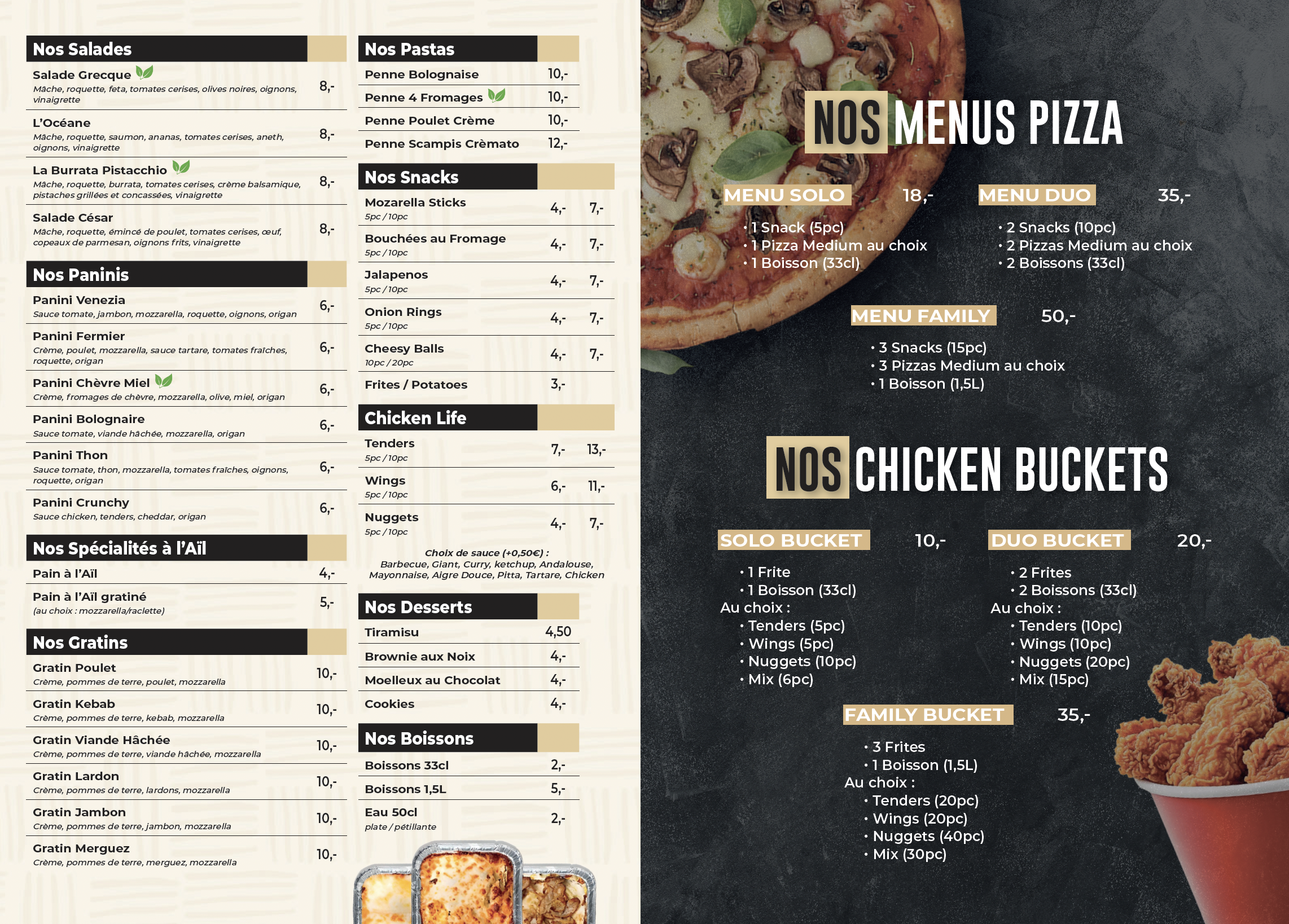Nous proposons une large gamme de pizzas, lasagnes, pasta, tapas, chicken, salades, desserts & Co